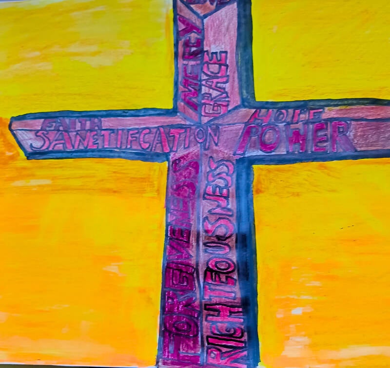 This is the original drawing of the cross that I was used for the original cover. Each word written on the cross stands for the full power that is represented when we think about Christ dying on the cross. Thus, the title "The full but Empty Cross of Jesus," the words written on the cross are Love, mercy, grace, faith, Salvation, hope, power, righteousness, forgiveness. This because when we see the cross of Jesus, we see the Love that Christ had for us by giving up his life for us. "Great love has no one than this, that someone lay down his life for his friends." John 15:13. Mercy is shown by the fact that God gave us his son as perfect sacrifice for us so that we can have a right relationship with God and that God give everyone a chance to repent and put their faith in trust Jesus Christ alone. "Remind them to be submissive to rulers and authorities, to be obedient, to be ready for every good work, to speak evil of no one, to avoid quarreling to be gentle, and show perfect courtesy toward all people. For we ourselves were once foolish, disobedient, led astray, slaves to various passions and pleasures, passing our day in malice and envy, hated by others and hating one another. But when the goodness and loving kindness of God our Savior appeared, he saved us not because of works done by us in righteousness, but according to his own mercy, by the washing of regeneration and the renewal of the Holy Spirit, whom he poured out on us richly through Jesus Christ our Savior, so that being justified by his grace we might become heirs according to the hope of eternal life. Titus 3:1-7. In this passage we not only read that God shown his mercy by the washing and renewal of the Holy Spirit, but we also see that being justified by his grace so that we might become hairs according to the hope of eternal life. Righteousness is shown by the fact that Christ became sin even though he knew no sin. 2Corinthains 5:21. Finally, we see forgiveness when Christ cries out to the Heavenly Father to forgive those who were crucifying him on the cross and those who were mocking him.