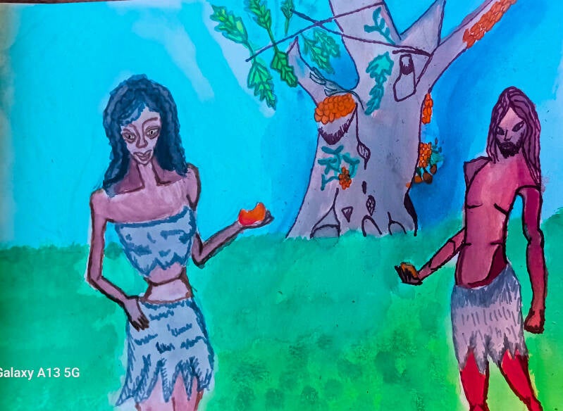 This picture is about the choices Adam and Eve had to make the day of the fall. It also about how we as society have the same choice to make which is to obey God or go our own way because we think we know better. This also is a part of "The Full but Empty Cross of Jessus" Because it tells us how God through his mercy and grace give us a choice. "But which person is tempted when he is lured and enticed by his own desires. Then desire when it has conceived gives birth to sin, and sin when it is fully grown brings forth death." James 1:14-15
