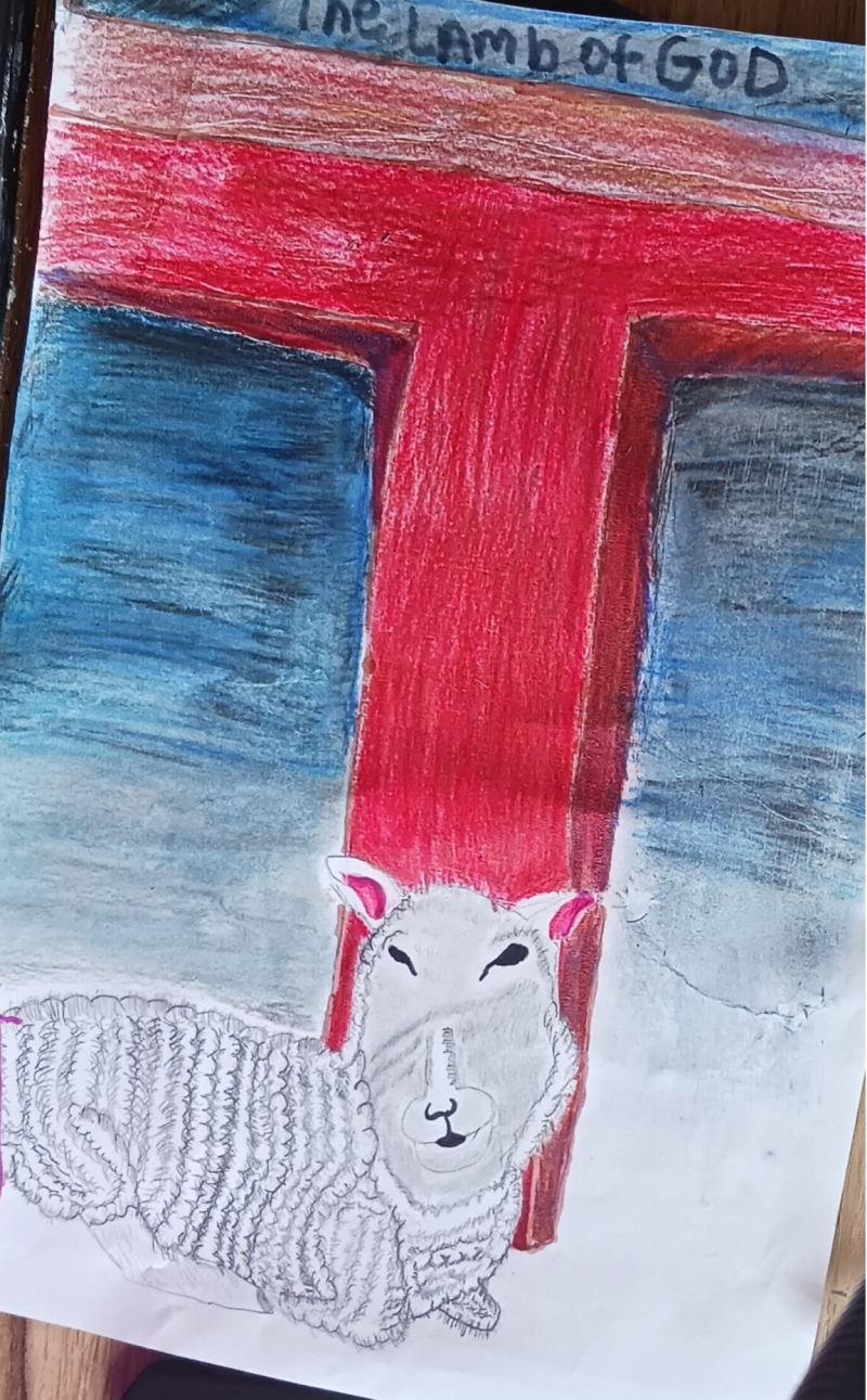 This the second drawing for "The Full but Empty Cross of Jesus" This a drawing of the Lamb of God laying at the foot of Cross because Christ went to the cross willing to die for our sins. Christ is the the perfect sacrifices for our sins. He is the Lamb with out blemishes or spot. Thus, the Full but Empty Cross of Jesus